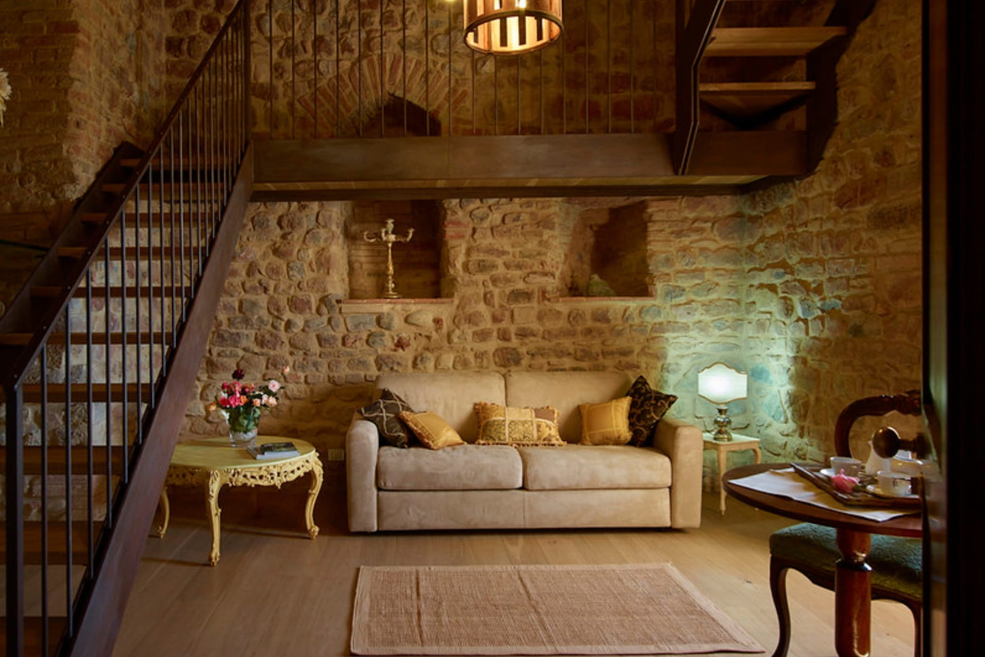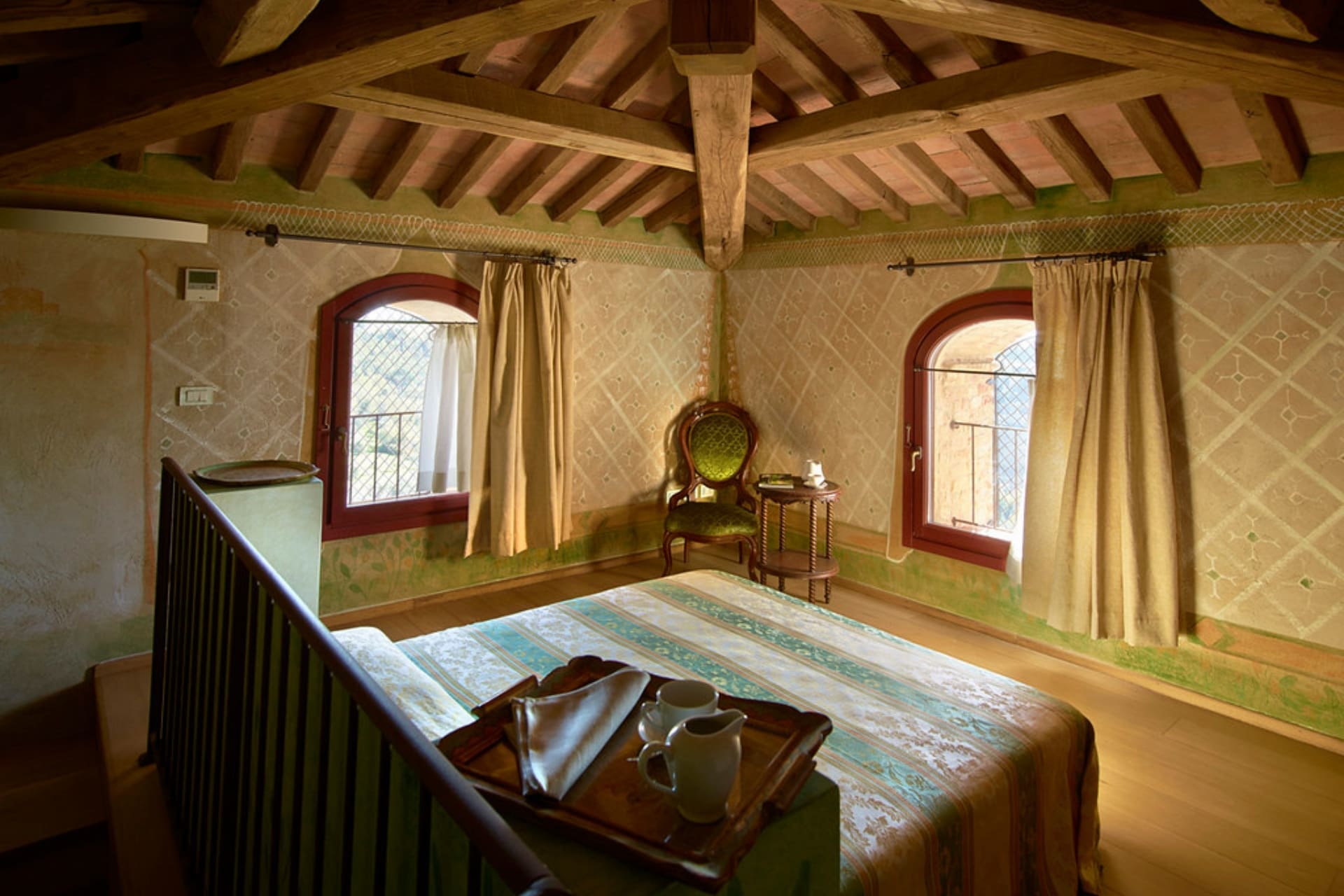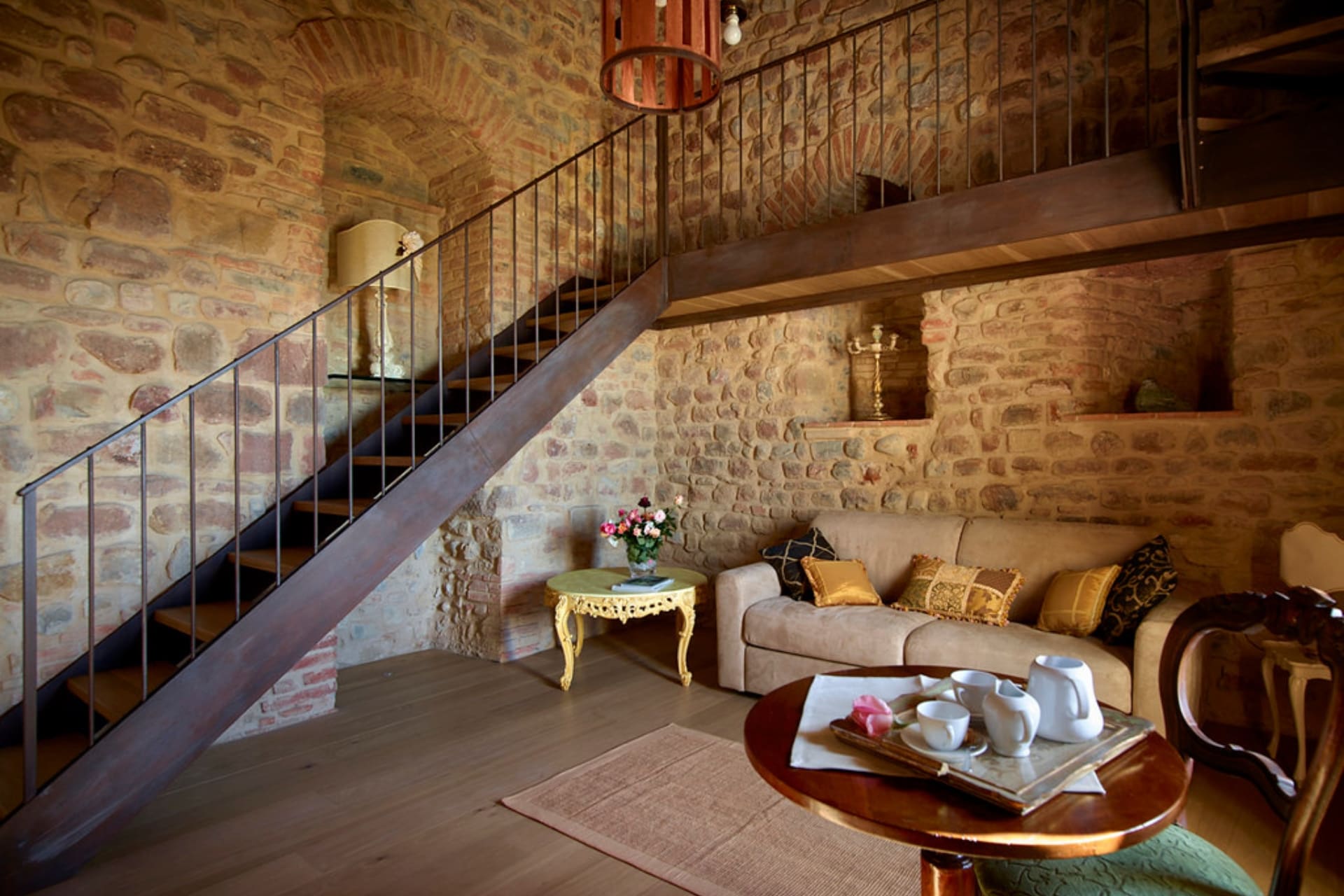 I soffitti a cassettoni, i pavimenti in cotto e parquet e le finestre a grigliato richiamano i vecchi fienili delle case coloniche toscane, donando alla suite un carattere autentico e raffinato.