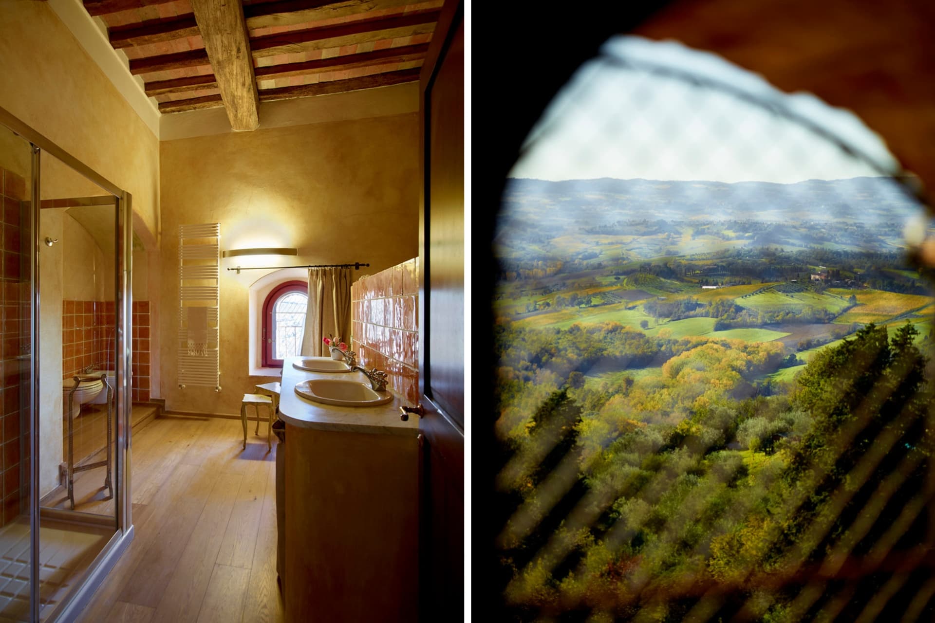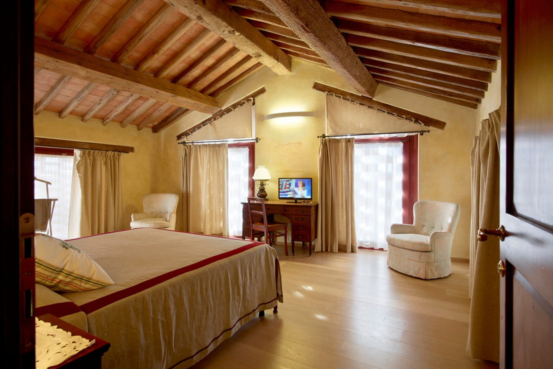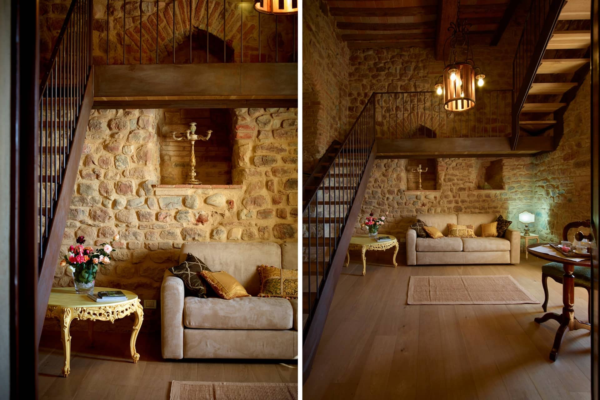I soffitti a cassettoni, i pavimenti in cotto e parquet e le finestre a grigliato richiamano i vecchi fienili delle case coloniche toscane, donando alla suite un carattere autentico e raffinato.